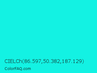CIELCh 86.597,50.382,187.129 Color is a normal cyan color and the nearest color is Bright Turquoise #08e8de. Hex code #13f2e3 and RGB value is rgb(19,242,227). In RGB color space, this color is composed of 7% red, 95% green, 89% blue, In CMYK color space, this color is composed of 92% cyan, 0% magenta, 6% yellow , 5% black , In HSL color space, this color has a hue angle of 176° , 90% saturation and 51% lightness.