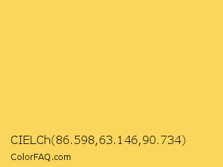 CIELCh 86.598,63.146,90.734 Color is a light yellow color and the nearest color is Naples Yellow #fada5e. Hex code #fad65c and RGB value is rgb(250,214,92). In RGB color space, this color is composed of 98% red, 84% green, 36% blue, In CMYK color space, this color is composed of 0% cyan, 14% magenta, 63% yellow , 2% black , In HSL color space, this color has a hue angle of 46° , 94% saturation and 67% lightness.