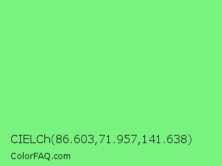 CIELCh 86.603,71.957,141.638 Color is a light green color and the nearest color is Pastel Green #77dd77. Hex code #7af280 and RGB value is rgb(122,242,128). In RGB color space, this color is composed of 48% red, 95% green, 50% blue, In CMYK color space, this color is composed of 50% cyan, 0% magenta, 47% yellow , 5% black , In HSL color space, this color has a hue angle of 123° , 82% saturation and 71% lightness.