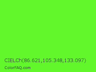 CIELCh 86.621,105.348,133.097 Color is a normal green color and the nearest color is Spring Frost #87ff2a. Hex code #61f72b and RGB value is rgb(97,247,43). In RGB color space, this color is composed of 38% red, 97% green, 17% blue, In CMYK color space, this color is composed of 61% cyan, 0% magenta, 83% yellow , 3% black , In HSL color space, this color has a hue angle of 104° , 93% saturation and 57% lightness.