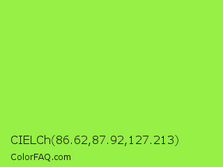 CIELCh 86.62,87.92,127.213 Color is a light green color and the nearest color is Kiwi #8ee53f. Hex code #96f045 and RGB value is rgb(150,240,69). In RGB color space, this color is composed of 59% red, 94% green, 27% blue, In CMYK color space, this color is composed of 38% cyan, 0% magenta, 71% yellow , 6% black , In HSL color space, this color has a hue angle of 92° , 85% saturation and 61% lightness.