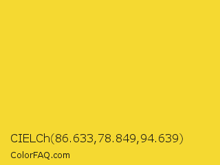CIELCh 86.633,78.849,94.639 Color is a normal yellow color and the nearest color is Golden Dream #f0d52d. Hex code #f5d931 and RGB value is rgb(245,217,49). In RGB color space, this color is composed of 96% red, 85% green, 19% blue, In CMYK color space, this color is composed of 0% cyan, 11% magenta, 80% yellow , 4% black , In HSL color space, this color has a hue angle of 51° , 91% saturation and 58% lightness.