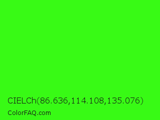 CIELCh 86.636,114.108,135.076 Color is a normal green color and the nearest color is Neon Green #39ff14. Hex code #38fa15 and RGB value is rgb(56,250,21). In RGB color space, this color is composed of 22% red, 98% green, 8% blue, In CMYK color space, this color is composed of 78% cyan, 0% magenta, 92% yellow , 2% black , In HSL color space, this color has a hue angle of 111° , 96% saturation and 53% lightness.