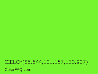 CIELCh 86.644,101.157,130.907 Color is a normal green color and the nearest color is Spring Frost #87ff2a. Hex code #75f52e and RGB value is rgb(117,245,46). In RGB color space, this color is composed of 46% red, 96% green, 18% blue, In CMYK color space, this color is composed of 52% cyan, 0% magenta, 81% yellow , 4% black , In HSL color space, this color has a hue angle of 99° , 91% saturation and 57% lightness.