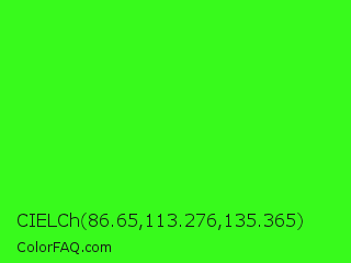 CIELCh 86.65,113.276,135.365 Color is a normal green color and the nearest color is Neon Green #39ff14. Hex code #38fa1c and RGB value is rgb(56,250,28). In RGB color space, this color is composed of 22% red, 98% green, 11% blue, In CMYK color space, this color is composed of 78% cyan, 0% magenta, 89% yellow , 2% black , In HSL color space, this color has a hue angle of 112° , 96% saturation and 55% lightness.