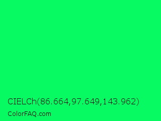 CIELCh 86.664,97.649,143.962 Color is a normal green color and the nearest color is Spring Green #00ff7f. Hex code #08fa63 and RGB value is rgb(8,250,99). In RGB color space, this color is composed of 3% red, 98% green, 39% blue, In CMYK color space, this color is composed of 97% cyan, 0% magenta, 60% yellow , 2% black , In HSL color space, this color has a hue angle of 143° , 96% saturation and 51% lightness.