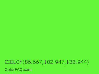 CIELCh 86.667,102.947,133.944 Color is a normal green color and the nearest color is Spring Frost #87ff2a. Hex code #61f736 and RGB value is rgb(97,247,54). In RGB color space, this color is composed of 38% red, 97% green, 21% blue, In CMYK color space, this color is composed of 61% cyan, 0% magenta, 78% yellow , 3% black , In HSL color space, this color has a hue angle of 107° , 92% saturation and 59% lightness.