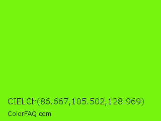 CIELCh 86.667,105.502,128.969 Color is a normal green color and the nearest color is Lawn Green #7cfc00. Hex code #78f50e and RGB value is rgb(120,245,14). In RGB color space, this color is composed of 47% red, 96% green, 5% blue, In CMYK color space, this color is composed of 51% cyan, 0% magenta, 94% yellow , 4% black , In HSL color space, this color has a hue angle of 92° , 92% saturation and 51% lightness.