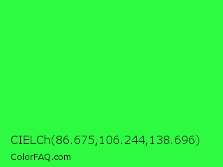 CIELCh 86.675,106.244,138.696 Color is a normal green color and the nearest color is Neon Green #39ff14. Hex code #2efa42 and RGB value is rgb(46,250,66). In RGB color space, this color is composed of 18% red, 98% green, 26% blue, In CMYK color space, this color is composed of 82% cyan, 0% magenta, 74% yellow , 2% black , In HSL color space, this color has a hue angle of 126° , 95% saturation and 58% lightness.