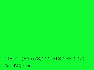 CIELCh 86.678,111.618,138.107 Color is a normal green color and the nearest color is Malachite #0bda51. Hex code #11fb33 and RGB value is rgb(17,251,51). In RGB color space, this color is composed of 7% red, 98% green, 20% blue, In CMYK color space, this color is composed of 93% cyan, 0% magenta, 80% yellow , 2% black , In HSL color space, this color has a hue angle of 129° , 97% saturation and 53% lightness.