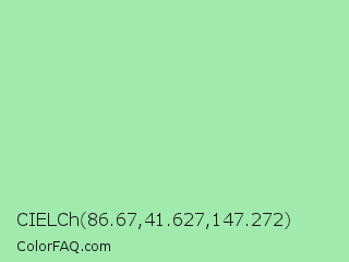 CIELCh 86.67,41.627,147.272 Color is a light green color and the nearest color is Teal Deer #99e6b3. Hex code #a0eaad and RGB value is rgb(160,234,173). In RGB color space, this color is composed of 63% red, 92% green, 68% blue, In CMYK color space, this color is composed of 32% cyan, 0% magenta, 26% yellow , 8% black , In HSL color space, this color has a hue angle of 131° , 64% saturation and 77% lightness.