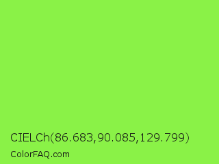 CIELCh 86.683,90.085,129.799 Color is a light green color and the nearest color is Kiwi #8ee53f. Hex code #8af247 and RGB value is rgb(138,242,71). In RGB color space, this color is composed of 54% red, 95% green, 28% blue, In CMYK color space, this color is composed of 43% cyan, 0% magenta, 71% yellow , 5% black , In HSL color space, this color has a hue angle of 96° , 87% saturation and 61% lightness.