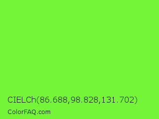 CIELCh 86.688,98.828,131.702 Color is a normal green color and the nearest color is Spring Frost #87ff2a. Hex code #75f538 and RGB value is rgb(117,245,56). In RGB color space, this color is composed of 46% red, 96% green, 22% blue, In CMYK color space, this color is composed of 52% cyan, 0% magenta, 77% yellow , 4% black , In HSL color space, this color has a hue angle of 101° , 90% saturation and 59% lightness.