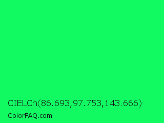 CIELCh 86.693,97.753,143.666 Color is a normal green color and the nearest color is Spring Green #00ff7f. Hex code #12fa62 and RGB value is rgb(18,250,98). In RGB color space, this color is composed of 7% red, 98% green, 38% blue, In CMYK color space, this color is composed of 93% cyan, 0% magenta, 61% yellow , 2% black , In HSL color space, this color has a hue angle of 141° , 96% saturation and 53% lightness.