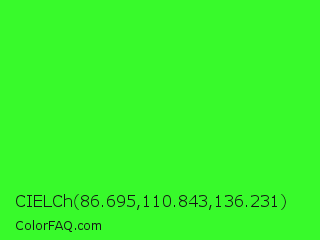 CIELCh 86.695,110.843,136.231 Color is a normal green color and the nearest color is Neon Green #39ff14. Hex code #38fa2b and RGB value is rgb(56,250,43). In RGB color space, this color is composed of 22% red, 98% green, 17% blue, In CMYK color space, this color is composed of 78% cyan, 0% magenta, 83% yellow , 2% black , In HSL color space, this color has a hue angle of 116° , 95% saturation and 57% lightness.