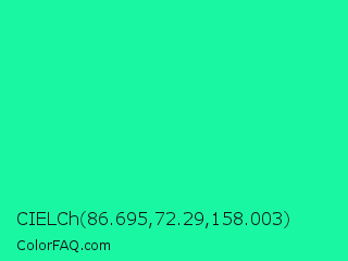 CIELCh 86.695,72.29,158.003 Color is a normal green color and the nearest color is Medium Spring Green #00fa9a. Hex code #1af7a3 and RGB value is rgb(26,247,163). In RGB color space, this color is composed of 10% red, 97% green, 64% blue, In CMYK color space, this color is composed of 89% cyan, 0% magenta, 34% yellow , 3% black , In HSL color space, this color has a hue angle of 157° , 93% saturation and 54% lightness.