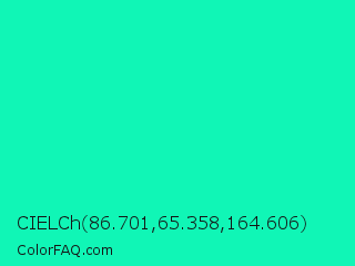 CIELCh 86.701,65.358,164.606 Color is a normal green color and the nearest color is Medium Spring Green #00fa9a. Hex code #10f6b6 and RGB value is rgb(16,246,182). In RGB color space, this color is composed of 6% red, 96% green, 71% blue, In CMYK color space, this color is composed of 93% cyan, 0% magenta, 26% yellow , 4% black , In HSL color space, this color has a hue angle of 163° , 93% saturation and 51% lightness.
