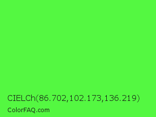 CIELCh 86.702,102.173,136.219 Color is a light green color and the nearest color is Screamin Green #66ff66. Hex code #54f841 and RGB value is rgb(84,248,65). In RGB color space, this color is composed of 33% red, 97% green, 25% blue, In CMYK color space, this color is composed of 66% cyan, 0% magenta, 74% yellow , 3% black , In HSL color space, this color has a hue angle of 114° , 93% saturation and 61% lightness.