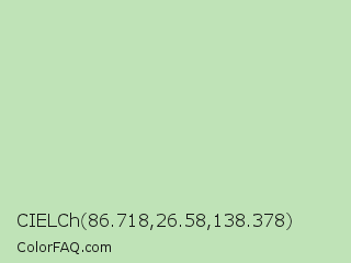 CIELCh 86.718,26.58,138.378 Color is a light green color and the nearest color is Pixie Green #c0d8b6. Hex code #bfe3b7 and RGB value is rgb(191,227,183). In RGB color space, this color is composed of 75% red, 89% green, 72% blue, In CMYK color space, this color is composed of 16% cyan, 0% magenta, 19% yellow , 11% black , In HSL color space, this color has a hue angle of 109° , 44% saturation and 80% lightness.