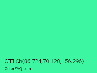 CIELCh 86.724,70.128,156.296 Color is a normal green color and the nearest color is Eucalyptus #44d7a8. Hex code #3cf6a1 and RGB value is rgb(60,246,161). In RGB color space, this color is composed of 24% red, 96% green, 63% blue, In CMYK color space, this color is composed of 76% cyan, 0% magenta, 35% yellow , 4% black , In HSL color space, this color has a hue angle of 153° , 91% saturation and 60% lightness.