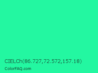 CIELCh 86.727,72.572,157.18 Color is a normal green color and the nearest color is Medium Spring Green #00fa9a. Hex code #23f7a1 and RGB value is rgb(35,247,161). In RGB color space, this color is composed of 14% red, 97% green, 63% blue, In CMYK color space, this color is composed of 86% cyan, 0% magenta, 35% yellow , 3% black , In HSL color space, this color has a hue angle of 156° , 93% saturation and 55% lightness.