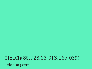 CIELCh 86.728,53.913,165.039 Color is a light green color and the nearest color is Medium Aquamarine #66ddaa. Hex code #5cf2bd and RGB value is rgb(92,242,189). In RGB color space, this color is composed of 36% red, 95% green, 74% blue, In CMYK color space, this color is composed of 62% cyan, 0% magenta, 22% yellow , 5% black , In HSL color space, this color has a hue angle of 159° , 85% saturation and 65% lightness.