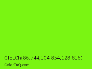 CIELCh 86.744,104.854,128.816 Color is a normal green color and the nearest color is Lawn Green #7cfc00. Hex code #7af512 and RGB value is rgb(122,245,18). In RGB color space, this color is composed of 48% red, 96% green, 7% blue, In CMYK color space, this color is composed of 50% cyan, 0% magenta, 93% yellow , 4% black , In HSL color space, this color has a hue angle of 93° , 92% saturation and 52% lightness.