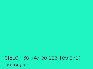 CIELCh 86.747,60.223,169.271 Color is a normal cyan color and the nearest color is Turquoise PWG #30d5c8. Hex code #1ff5c2 and RGB value is rgb(31,245,194). In RGB color space, this color is composed of 12% red, 96% green, 76% blue, In CMYK color space, this color is composed of 87% cyan, 0% magenta, 21% yellow , 4% black , In HSL color space, this color has a hue angle of 166° , 91% saturation and 54% lightness.