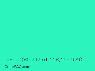 CIELCh 86.747,61.118,166.929 Color is a normal green color and the nearest color is Turquoise PWG #30d5c8. Hex code #2bf5bd and RGB value is rgb(43,245,189). In RGB color space, this color is composed of 17% red, 96% green, 74% blue, In CMYK color space, this color is composed of 82% cyan, 0% magenta, 23% yellow , 4% black , In HSL color space, this color has a hue angle of 163° , 91% saturation and 56% lightness.