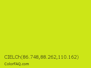 CIELCh 86.748,88.262,110.162 Color is a normal yellow color and the nearest color is Las Palmas #c6e610. Hex code #cce617 and RGB value is rgb(204,230,23). In RGB color space, this color is composed of 80% red, 90% green, 9% blue, In CMYK color space, this color is composed of 11% cyan, 0% magenta, 90% yellow , 10% black , In HSL color space, this color has a hue angle of 68° , 82% saturation and 50% lightness.