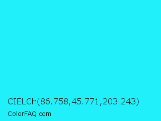 CIELCh 86.758,45.771,203.243 Color is a normal cyan color and the nearest color is Loeen #15f2fd. Hex code #1ff0fa and RGB value is rgb(31,240,250). In RGB color space, this color is composed of 12% red, 94% green, 98% blue, In CMYK color space, this color is composed of 88% cyan, 4% magenta, 0% yellow , 2% black , In HSL color space, this color has a hue angle of 183° , 96% saturation and 55% lightness.
