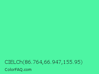 CIELCh 86.764,66.947,155.95 Color is a light green color and the nearest color is Eucalyptus #44d7a8. Hex code #4df5a3 and RGB value is rgb(77,245,163). In RGB color space, this color is composed of 30% red, 96% green, 64% blue, In CMYK color space, this color is composed of 69% cyan, 0% magenta, 33% yellow , 4% black , In HSL color space, this color has a hue angle of 151° , 89% saturation and 63% lightness.