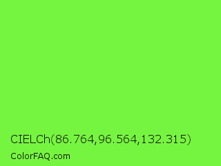 CIELCh 86.764,96.564,132.315 Color is a light green color and the nearest color is Kiwi #8ee53f. Hex code #76f540 and RGB value is rgb(118,245,64). In RGB color space, this color is composed of 46% red, 96% green, 25% blue, In CMYK color space, this color is composed of 52% cyan, 0% magenta, 74% yellow , 4% black , In HSL color space, this color has a hue angle of 102° , 90% saturation and 61% lightness.