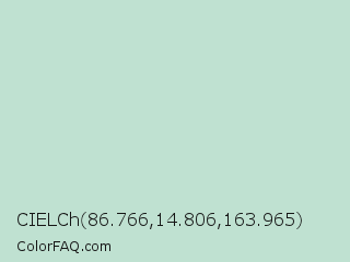 CIELCh 86.766,14.806,163.965 Color is a very light green color and the nearest color is Edgewater #c8e3d7. Hex code #bfe1d1 and RGB value is rgb(191,225,209). In RGB color space, this color is composed of 75% red, 88% green, 82% blue, In CMYK color space, this color is composed of 15% cyan, 0% magenta, 7% yellow , 12% black , In HSL color space, this color has a hue angle of 152° , 36% saturation and 82% lightness.