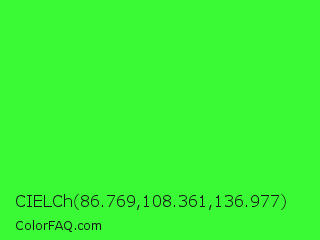 CIELCh 86.769,108.361,136.977 Color is a normal green color and the nearest color is Neon Green #39ff14. Hex code #3afa36 and RGB value is rgb(58,250,54). In RGB color space, this color is composed of 23% red, 98% green, 21% blue, In CMYK color space, this color is composed of 77% cyan, 0% magenta, 78% yellow , 2% black , In HSL color space, this color has a hue angle of 119° , 95% saturation and 60% lightness.