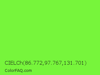 CIELCh 86.772,97.767,131.701 Color is a normal green color and the nearest color is Spring Frost #87ff2a. Hex code #77f53b and RGB value is rgb(119,245,59). In RGB color space, this color is composed of 47% red, 96% green, 23% blue, In CMYK color space, this color is composed of 51% cyan, 0% magenta, 76% yellow , 4% black , In HSL color space, this color has a hue angle of 101° , 90% saturation and 60% lightness.