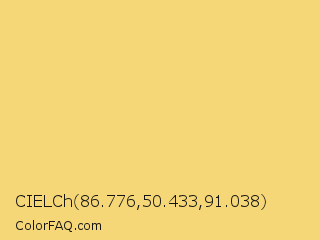 CIELCh 86.776,50.433,91.038 Color is a light orange color and the nearest color is Golden Sand #f0db7d. Hex code #f6d778 and RGB value is rgb(246,215,120). In RGB color space, this color is composed of 96% red, 84% green, 47% blue, In CMYK color space, this color is composed of 0% cyan, 13% magenta, 51% yellow , 4% black , In HSL color space, this color has a hue angle of 45° , 88% saturation and 72% lightness.