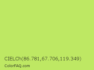 CIELCh 86.781,67.706,119.349 Color is a light lime color and the nearest color is Inchworm #b2ec5d. Hex code #bee863 and RGB value is rgb(190,232,99). In RGB color space, this color is composed of 75% red, 91% green, 39% blue, In CMYK color space, this color is composed of 18% cyan, 0% magenta, 57% yellow , 9% black , In HSL color space, this color has a hue angle of 79° , 74% saturation and 65% lightness.