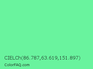 CIELCh 86.787,63.619,151.897 Color is a light green color and the nearest color is Medium Aquamarine #66ddaa. Hex code #69f39e and RGB value is rgb(105,243,158). In RGB color space, this color is composed of 41% red, 95% green, 62% blue, In CMYK color space, this color is composed of 57% cyan, 0% magenta, 35% yellow , 5% black , In HSL color space, this color has a hue angle of 143° , 85% saturation and 68% lightness.