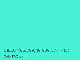 CIELCh 86.799,49.909,177.741 Color is a light cyan color and the nearest color is Turquoise #40e0d0. Hex code #47f2d4 and RGB value is rgb(71,242,212). In RGB color space, this color is composed of 28% red, 95% green, 83% blue, In CMYK color space, this color is composed of 71% cyan, 0% magenta, 12% yellow , 5% black , In HSL color space, this color has a hue angle of 169° , 87% saturation and 61% lightness.