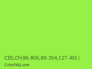 CIELCh 86.806,89.304,127.491 Color is a normal green color and the nearest color is Kiwi #8ee53f. Hex code #94f143 and RGB value is rgb(148,241,67). In RGB color space, this color is composed of 58% red, 95% green, 26% blue, In CMYK color space, this color is composed of 39% cyan, 0% magenta, 72% yellow , 5% black , In HSL color space, this color has a hue angle of 92° , 86% saturation and 60% lightness.
