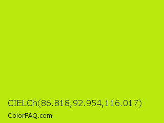 CIELCh 86.818,92.954,116.017 Color is a normal lime color and the nearest color is Inch Worm #b0e313. Hex code #b8eb0d and RGB value is rgb(184,235,13). In RGB color space, this color is composed of 72% red, 92% green, 5% blue, In CMYK color space, this color is composed of 22% cyan, 0% magenta, 94% yellow , 8% black , In HSL color space, this color has a hue angle of 74° , 90% saturation and 49% lightness.