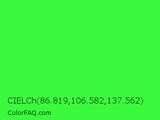 CIELCh 86.819,106.582,137.562 Color is a light green color and the nearest color is Neon Green #39ff14. Hex code #3bfa3d and RGB value is rgb(59,250,61). In RGB color space, this color is composed of 23% red, 98% green, 24% blue, In CMYK color space, this color is composed of 76% cyan, 0% magenta, 76% yellow , 2% black , In HSL color space, this color has a hue angle of 121° , 95% saturation and 61% lightness.