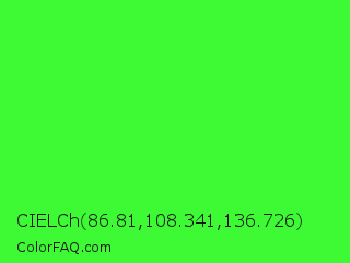 CIELCh 86.81,108.341,136.726 Color is a normal green color and the nearest color is Neon Green #39ff14. Hex code #3dfa35 and RGB value is rgb(61,250,53). In RGB color space, this color is composed of 24% red, 98% green, 21% blue, In CMYK color space, this color is composed of 76% cyan, 0% magenta, 79% yellow , 2% black , In HSL color space, this color has a hue angle of 118° , 95% saturation and 59% lightness.