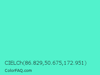 CIELCh 86.829,50.675,172.951 Color is a light cyan color and the nearest color is Turquoise #40e0d0. Hex code #52f2cc and RGB value is rgb(82,242,204). In RGB color space, this color is composed of 32% red, 95% green, 80% blue, In CMYK color space, this color is composed of 66% cyan, 0% magenta, 16% yellow , 5% black , In HSL color space, this color has a hue angle of 166° , 86% saturation and 64% lightness.