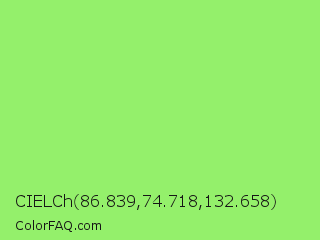 CIELCh 86.839,74.718,132.658 Color is a light green color and the nearest color is Inchworm #b2ec5d. Hex code #94f06b and RGB value is rgb(148,240,107). In RGB color space, this color is composed of 58% red, 94% green, 42% blue, In CMYK color space, this color is composed of 38% cyan, 0% magenta, 55% yellow , 6% black , In HSL color space, this color has a hue angle of 102° , 82% saturation and 68% lightness.