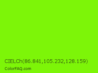 CIELCh 86.841,105.232,128.159 Color is a normal green color and the nearest color is Lawn Green #7cfc00. Hex code #7df508 and RGB value is rgb(125,245,8). In RGB color space, this color is composed of 49% red, 96% green, 3% blue, In CMYK color space, this color is composed of 49% cyan, 0% magenta, 97% yellow , 4% black , In HSL color space, this color has a hue angle of 90° , 94% saturation and 50% lightness.