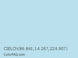 CIELCh 86.841,14.267,224.907 Color is a very light blue color and the nearest color is Powder Blue #b0e0e6. Hex code #b9e0ec and RGB value is rgb(185,224,236). In RGB color space, this color is composed of 73% red, 88% green, 93% blue, In CMYK color space, this color is composed of 22% cyan, 5% magenta, 0% yellow , 7% black , In HSL color space, this color has a hue angle of 194° , 57% saturation and 83% lightness.