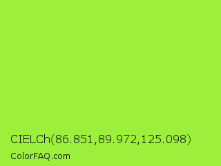 CIELCh 86.851,89.972,125.098 Color is a normal green color and the nearest color is French Lime #9efd38. Hex code #9cf03b and RGB value is rgb(156,240,59). In RGB color space, this color is composed of 61% red, 94% green, 23% blue, In CMYK color space, this color is composed of 35% cyan, 0% magenta, 75% yellow , 6% black , In HSL color space, this color has a hue angle of 88° , 86% saturation and 59% lightness.
