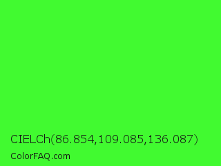 CIELCh 86.854,109.085,136.087 Color is a normal green color and the nearest color is Neon Green #39ff14. Hex code #41fa30 and RGB value is rgb(65,250,48). In RGB color space, this color is composed of 25% red, 98% green, 19% blue, In CMYK color space, this color is composed of 74% cyan, 0% magenta, 81% yellow , 2% black , In HSL color space, this color has a hue angle of 115° , 95% saturation and 58% lightness.
